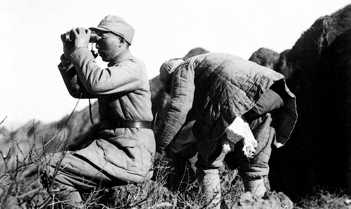 八路軍第115師一部在聶榮臻的率領下,以五臺山為中心,在華北創建了第一個敵后抗日根據地——晉察冀抗日根據地。圖為晉察冀軍區司令員兼政治委員聶榮臻親臨前線指揮作戰。