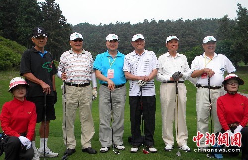 5月27日晚間,在南京紫金山莊,第二屆“黃埔情·中評杯”兩岸退役將軍高爾夫球邀請賽落幕,兩岸退役將軍與銀杏湖高爾夫球童合影。中新社發 朱曉穎 攝